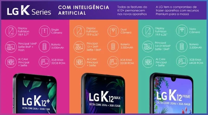 A LG já havia apresentado para o mercado brasileiro, em março, o smartphone LG K12+. E para completar a família, a empresa apresentou, em 2 de julho, os modelos K12 Prime e K12 Max.