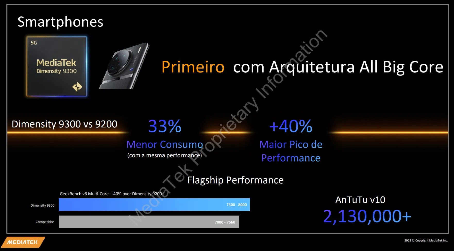 A MediaTek anunciou o Dimensity 9300, seu mais novo chipset flagship para dispositivos móveis, com um design único All Big Core. Essa configuração exclusiva da MediaTek combina alto desempenho com a eficiência energética líder no setor, para oferecer experiências fluidas para usuários, em jogos, captura de vídeo e processamento de IA generativa nos dispositivos, seja smartphones ou tablets.