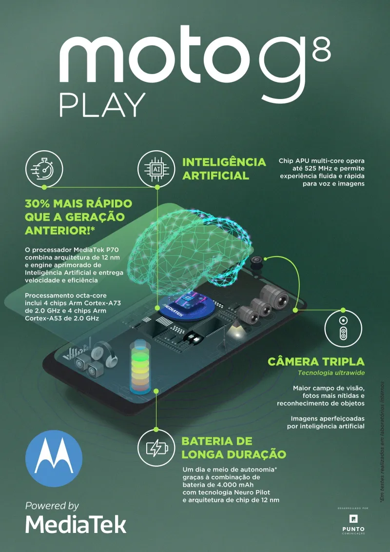 Essa CPU tem 8 núcleos que podem chegar a 2.0 GHz em sua frequência de trabalho. Segundo a Motorola, O Moto G8 Play está 30% mais rápido do que a geração anterior, o Moto G7 Play. O infográfico abaixo mostra com clareza as vantagens.