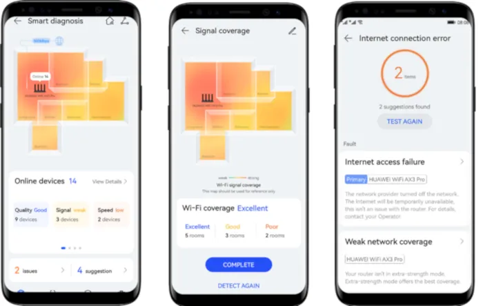 Outra função de destaque é o Diagnóstico Inteligente, que analisa o status do Wi-Fi e de cada dispositivo conectado, trazendo sugestões de melhoria para resolver eventuais problemas de rede e otimizar o ambiente digital.