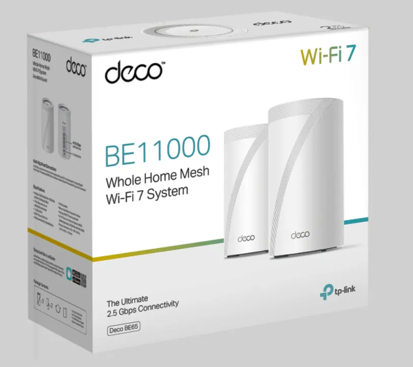 O Deco BE65 é um roteador mesh de categoria intermediária com suporte ao novo padrão Wi-Fi 7 (802.11be). Ele está disponível em pacotes com 1, 2 ou 3 unidades e cada unidade oferece:
